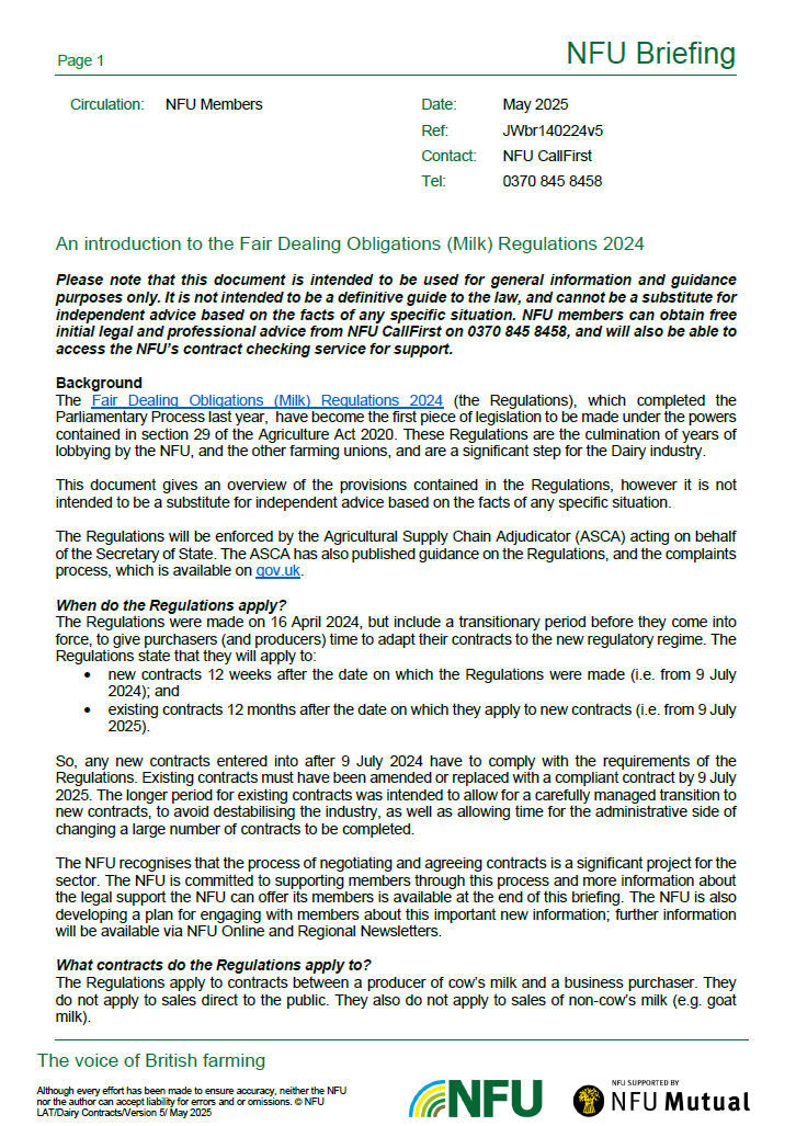 We will be setting up a number of regional meetings and producing materials to assist our dairy members in understanding the regulations. Free initial legal and professional advice is also available to NFU members through NFU CallFirst.